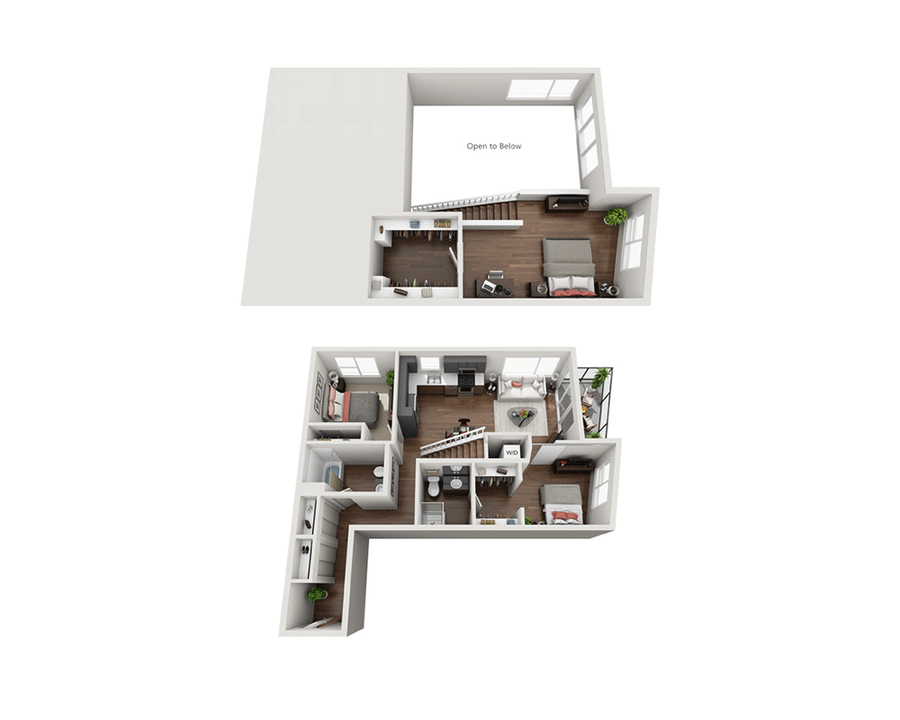 3D floor plan of a two-story apartment with bedrooms, bathrooms, kitchen, living area, staircase, and an open-to-below space, all shown with modern furniture and wood flooring.